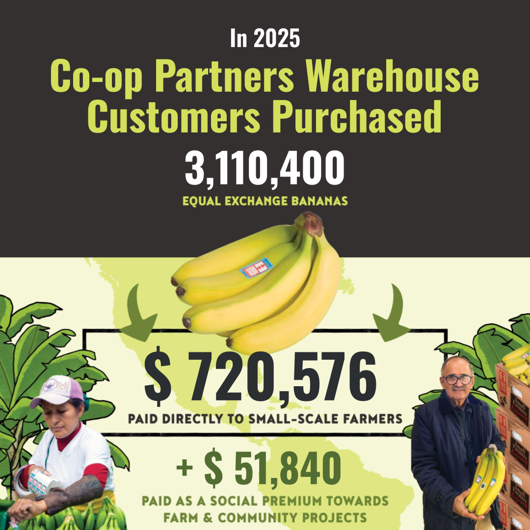 “Equal Exchange and Coliman both supply Co-op Partners Warehouse with certified Fair Trade organic bananas from South America & Mexico. To combat the banana industry’s infamous exploitative labor practices, the Fair Trade Premium that is part of the purchase cost of each case of bananas is invested back into the farmers’ communities in the form of healthcare, education, and infrastructure. Also, for the bananas to qualify for Fair Trade certification, the base wages paid by farmers must equal at least 70% of that country’s living wage.”